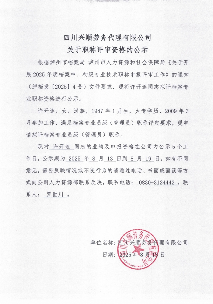 關(guān)于許開連申請擬評檔案專業(yè)員級(管理員)職稱的公示
